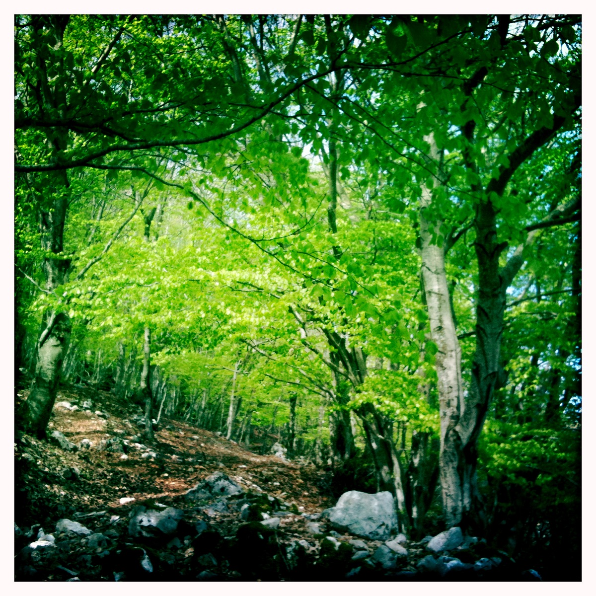 E nello scendere scopro che la nuova valle, al secolo Valle Iannanghera, è davvero una meraviglia: ha un faggeto talmente vasto ed imponente che alcuni suoi alberi vengono chiamati “patriarchi”. E’ così fitta che non si vede oltre il proprio naso, ma ogni tanto si apre con dei campi improvvisi senza alberi pieni di sole. Ha una fonte di acqua gelata e milioni di uccelli. Talpe e bucaneve. Rami, rami, foglie.
