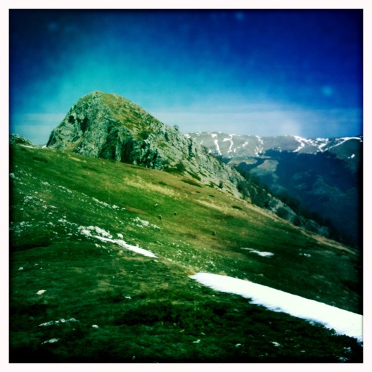Superata la cresta, da quel punto in poi abbiamo trovato neve-neve-neve, ma almeno non c’era il rischio di scivolare; poi rifugio, pane carasau (non-mi-chiedete) e formaggio abruzzese e poi discesa-discesa-discesa.